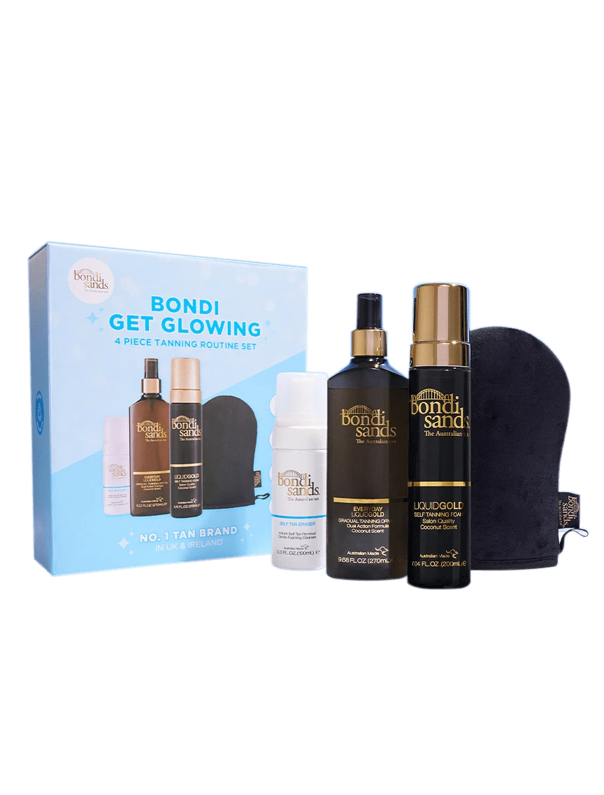 The Bondi Get Glowing 4 Piece Liquid Gold Tanning Routine Set includes everything you need to achieve that flawless, glowing tan.
