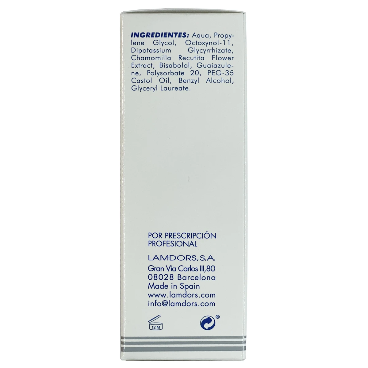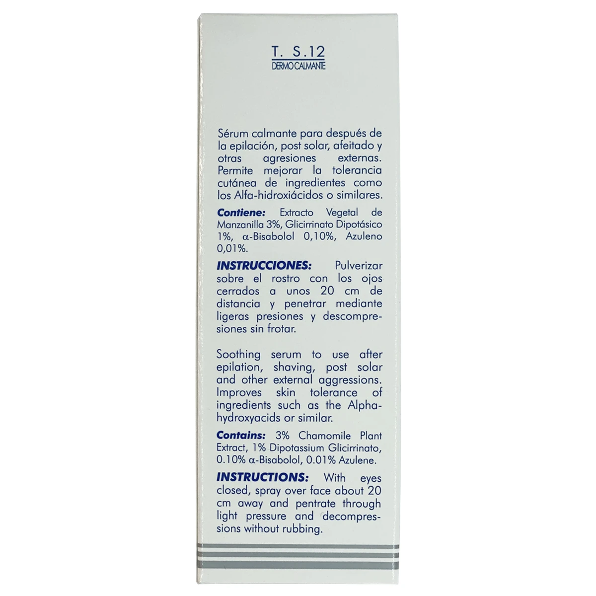 T.S. 12 Contiene: Extracto Vegetal de Manzanilla 3%, Glicirrinato Dipotásico 1%, alfa-Bisabolol 0,10%, Azuleno 0,01%.