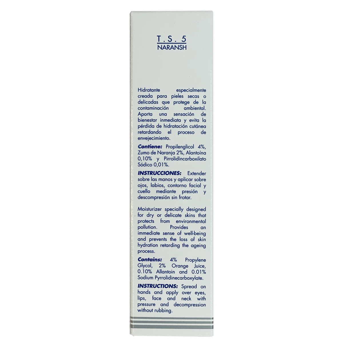 T.S.5 NARANSH es una crema de día rica en Vitamina C especialmente creada para pieles secas o sensibles que protege de la contaminación ambiental. TS 5 Aporta una sensación de bienestar inmediata y evita la pérdida de hidratación cutánea retardando el proceso de envejecimiento. Puede recomendar su aplicación de noche en pieles muy secas.
