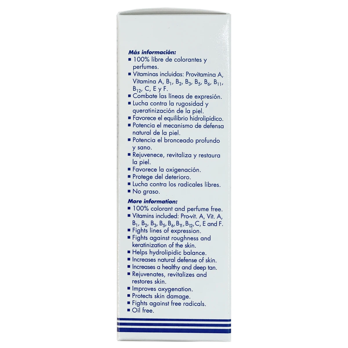 Vitaminas incluidas: Provitamina A, Vitamina A, B1, B2, B3, B5, B6, B8, B11, B12, C, E y F.