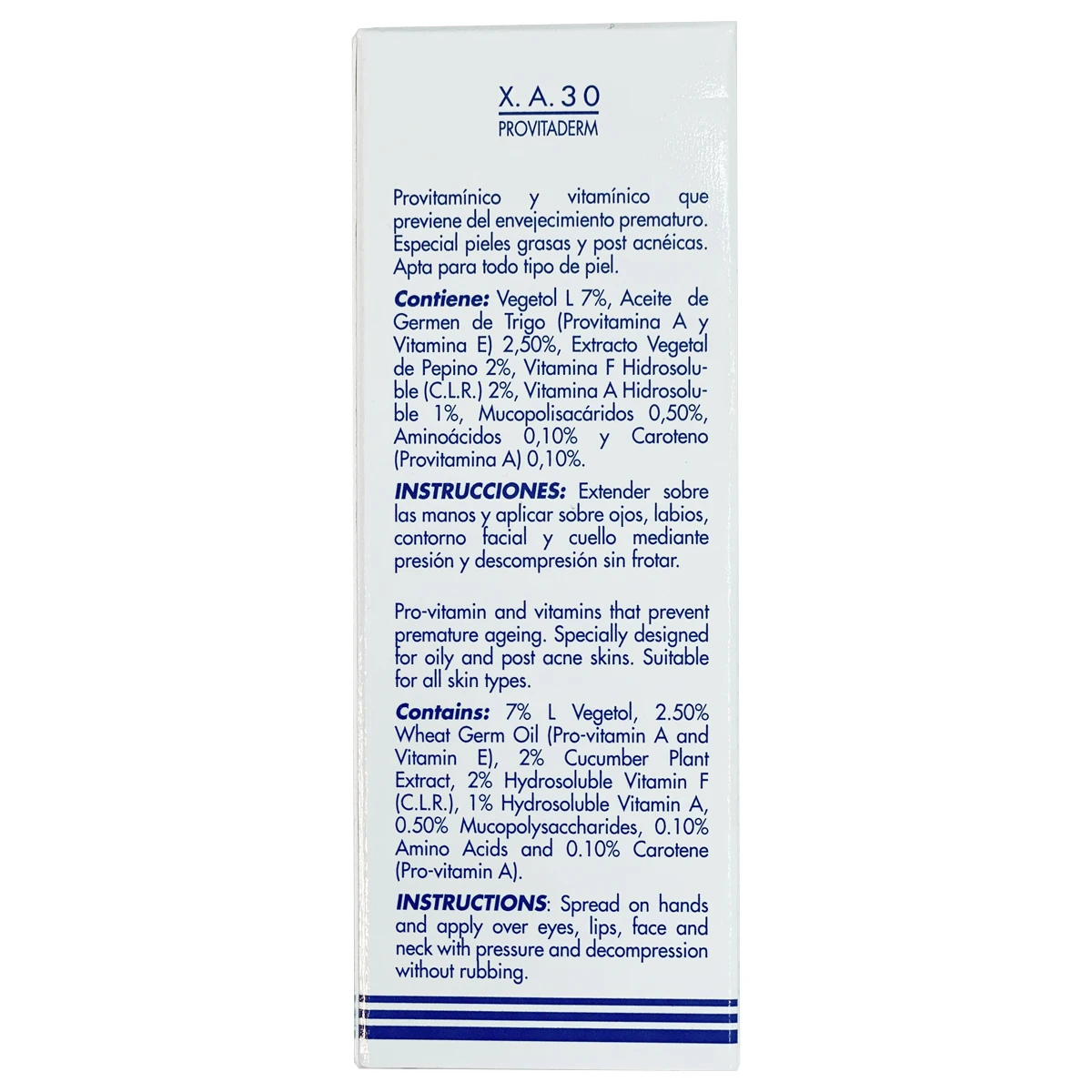 La Fórmula X.A. 30 PROVITADERM es un complejo provitamínico y vitamínico que permite la regeneración y protección de la piel potenciando sus funciones vitales. XA30 Previene del envejecimiento prematuro y del deterioro. Por su composición es apta para todo tipo de piel. Es ionizable y bipolar.