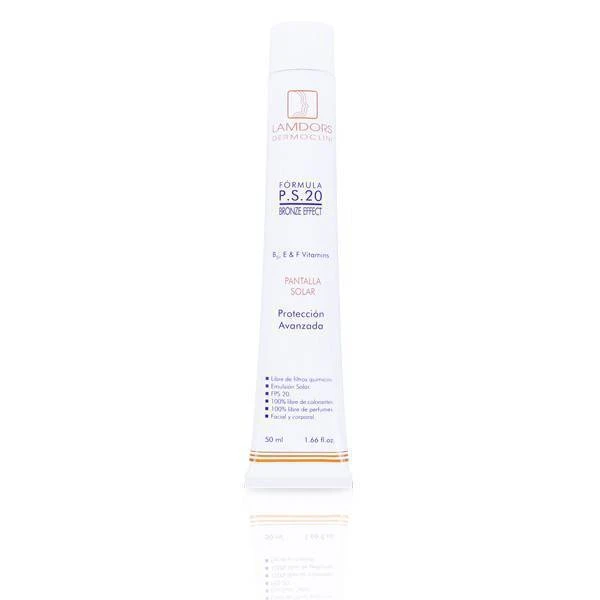 PS20 Es una fórmula exclusiva, especialmente elaborada, no irritante, a base de Dióxido de Titanio Micronizado en combinación con un complejo especial de Vitaminas B5, E y F, es un verdadero sistema de tratamiento protector para el sol.