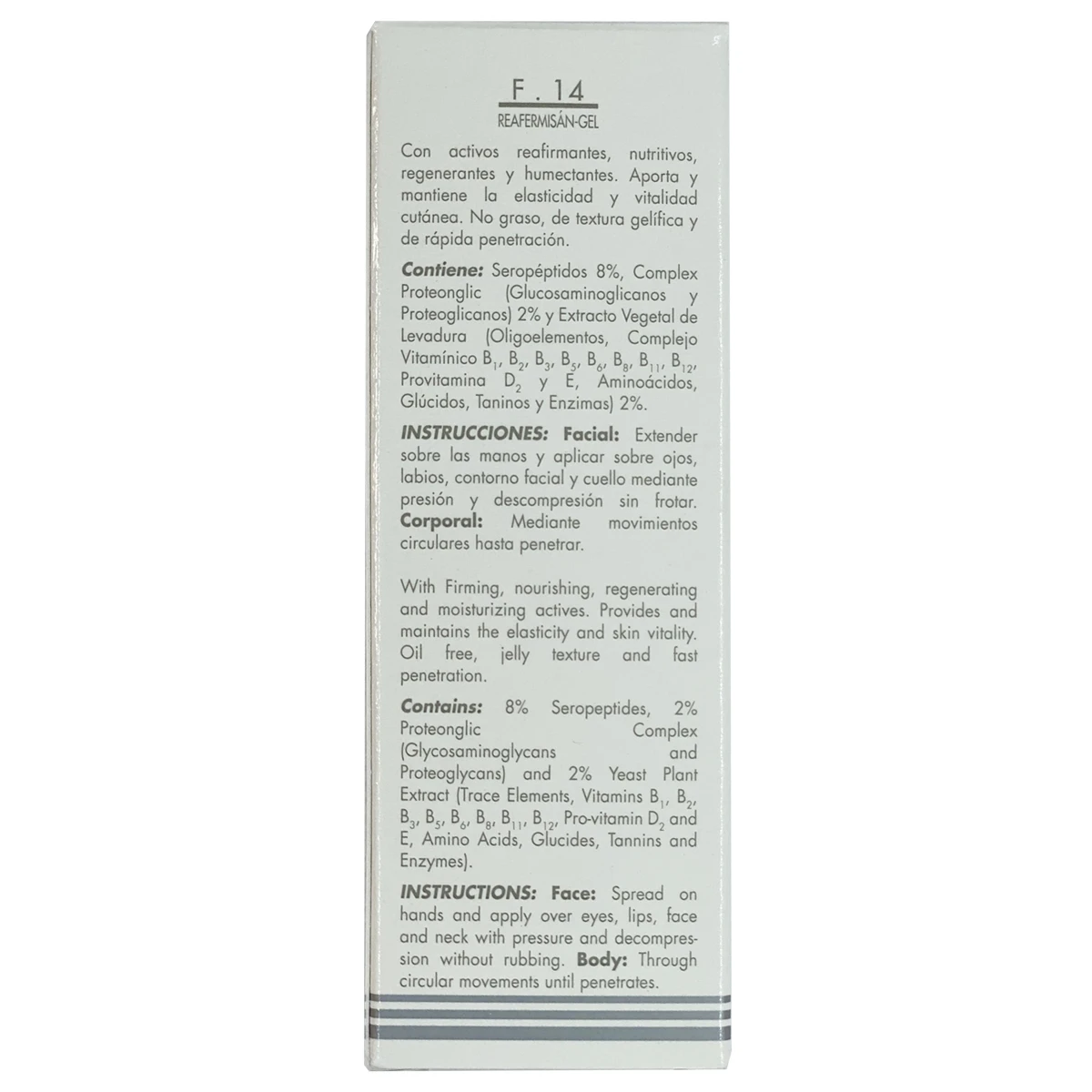 REAFERMISÁN-GEL F14 de Lamdors es una fórmula de textura gelífica, no grasa, fría y de rápida penetración. Aporta tonacidad, firmeza y turgencia. Su acción reafirmante, regeneradora, reparadora, protectora y humectante, mantiene la elasticidad y vitalidad cutánea.