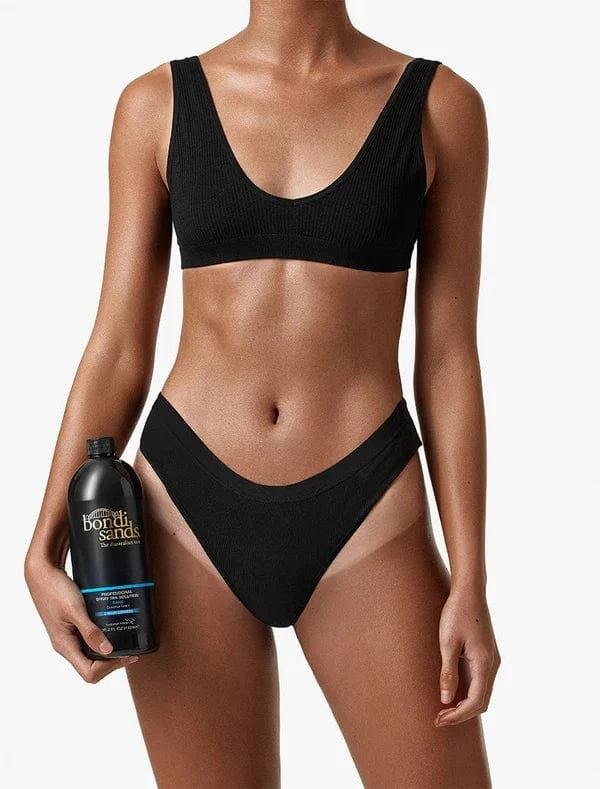 Bondi Sands fast drying Professional Spray Tan Solution is enriched with aloe vera, infused with the fresh scent of coconut and may be washed off 2 hours after application.