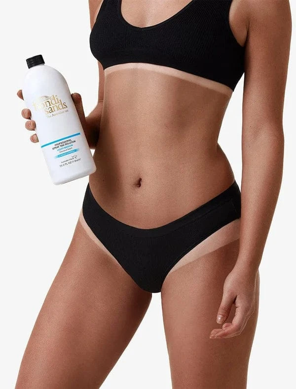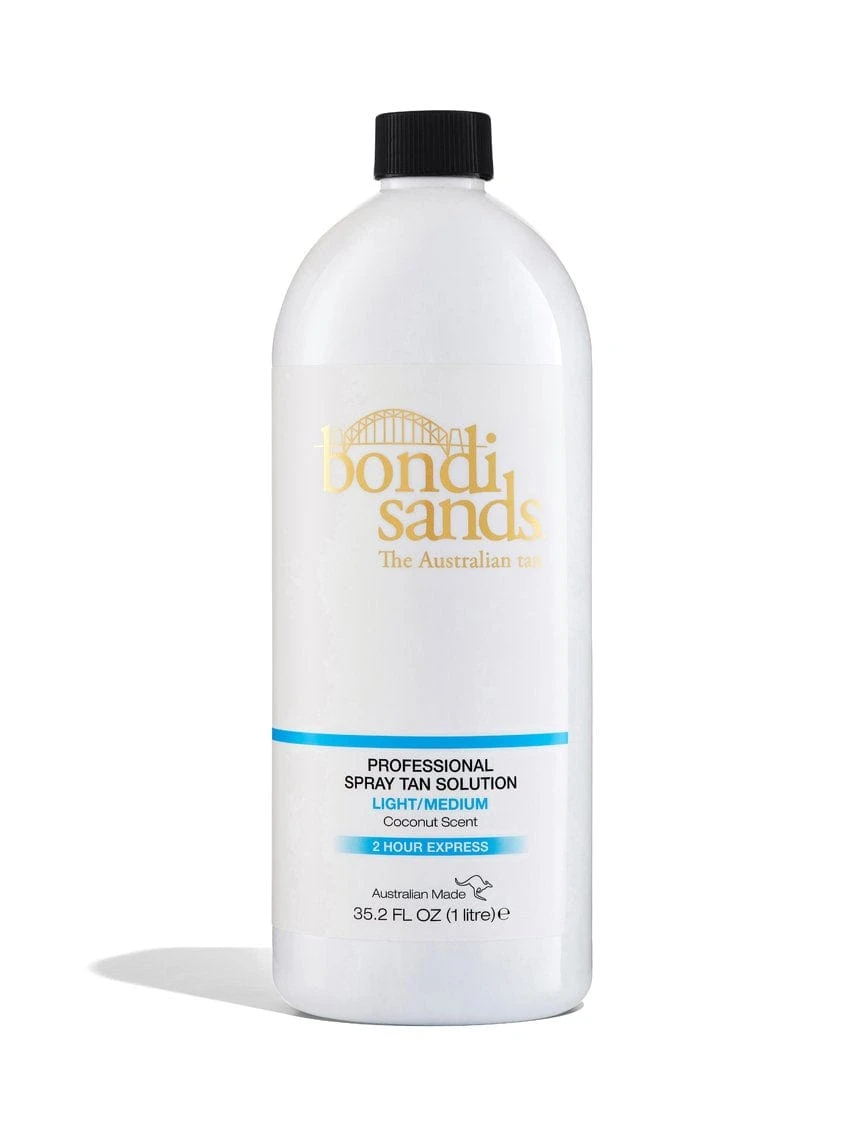 Bondi Sands fast drying Professional Spray Tan Solution is enriched with aloe vera, infused with the fresh scent of coconut and may be washed off 2 hours after application.